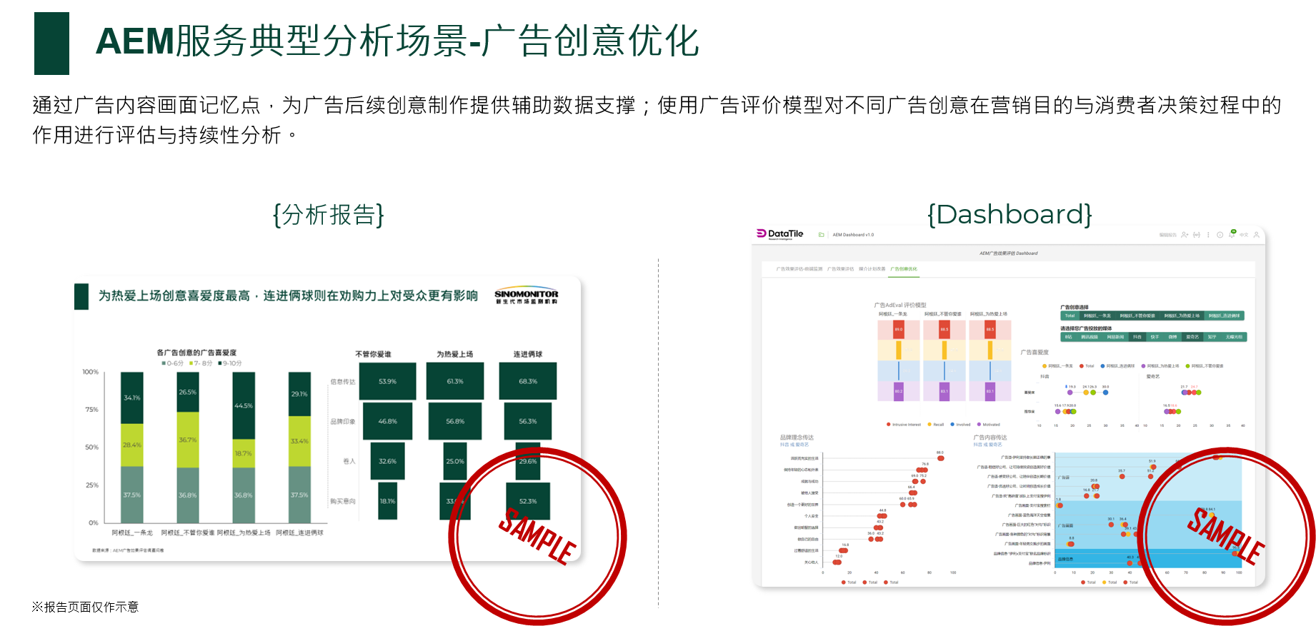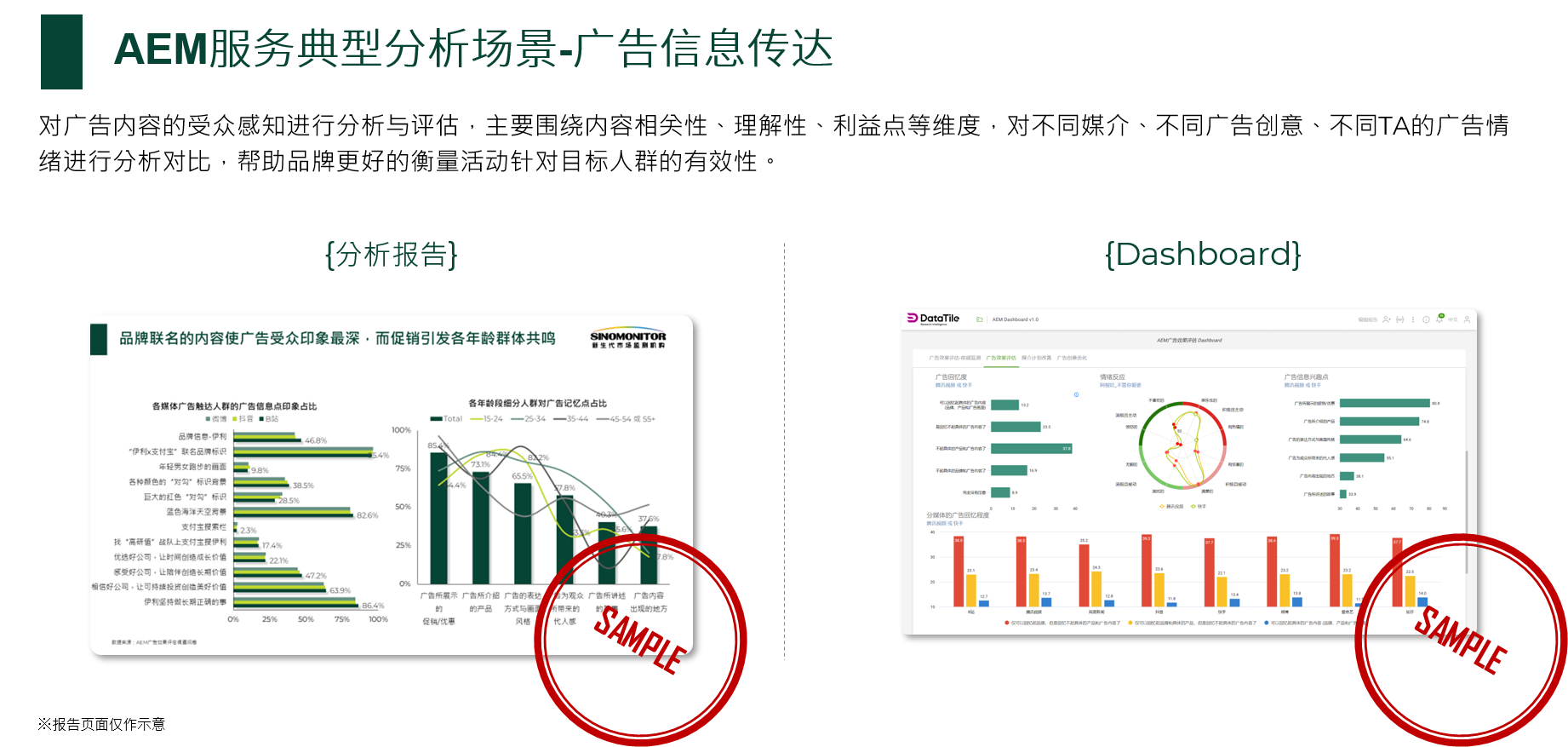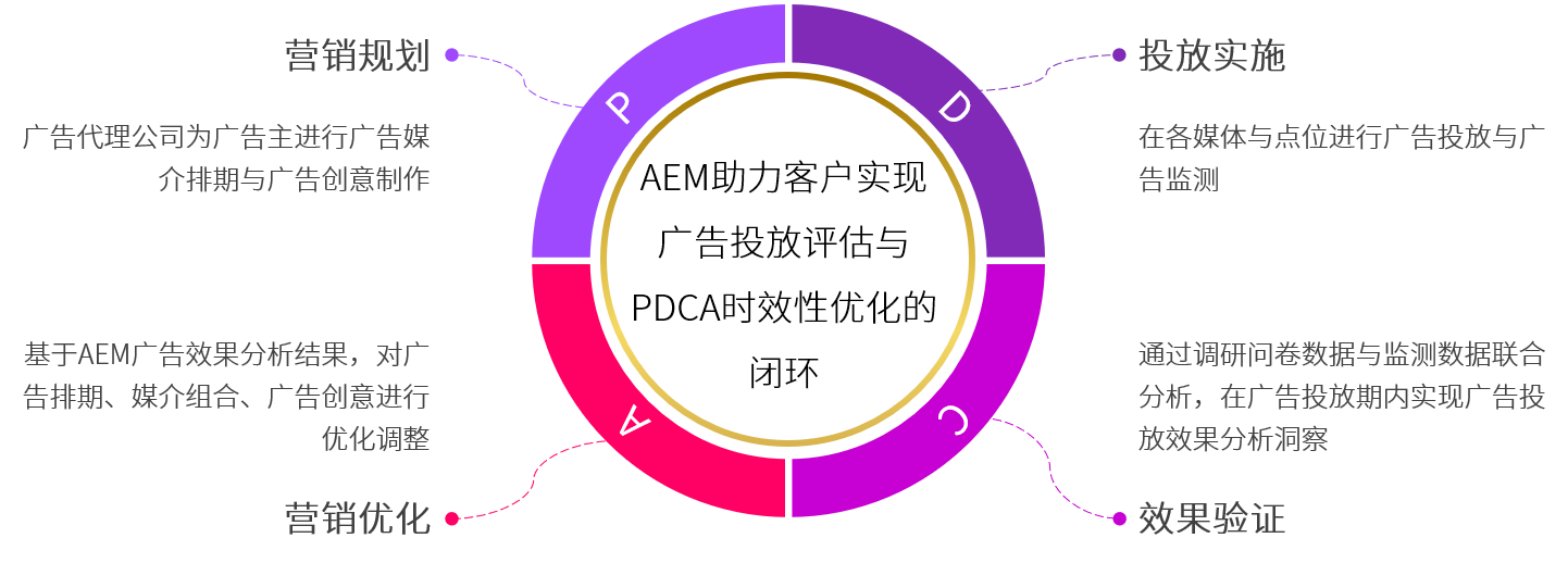 对于线下的广告效果评估主要通过问卷的研究方式进行心智层面的表现数据收集,对于线上广告则通过调研数据与互联网监测数据的打通,将用户的品牌心智表现与媒体接触数据进行打通,因此我们推出AEM服务,完善分析的数据维度